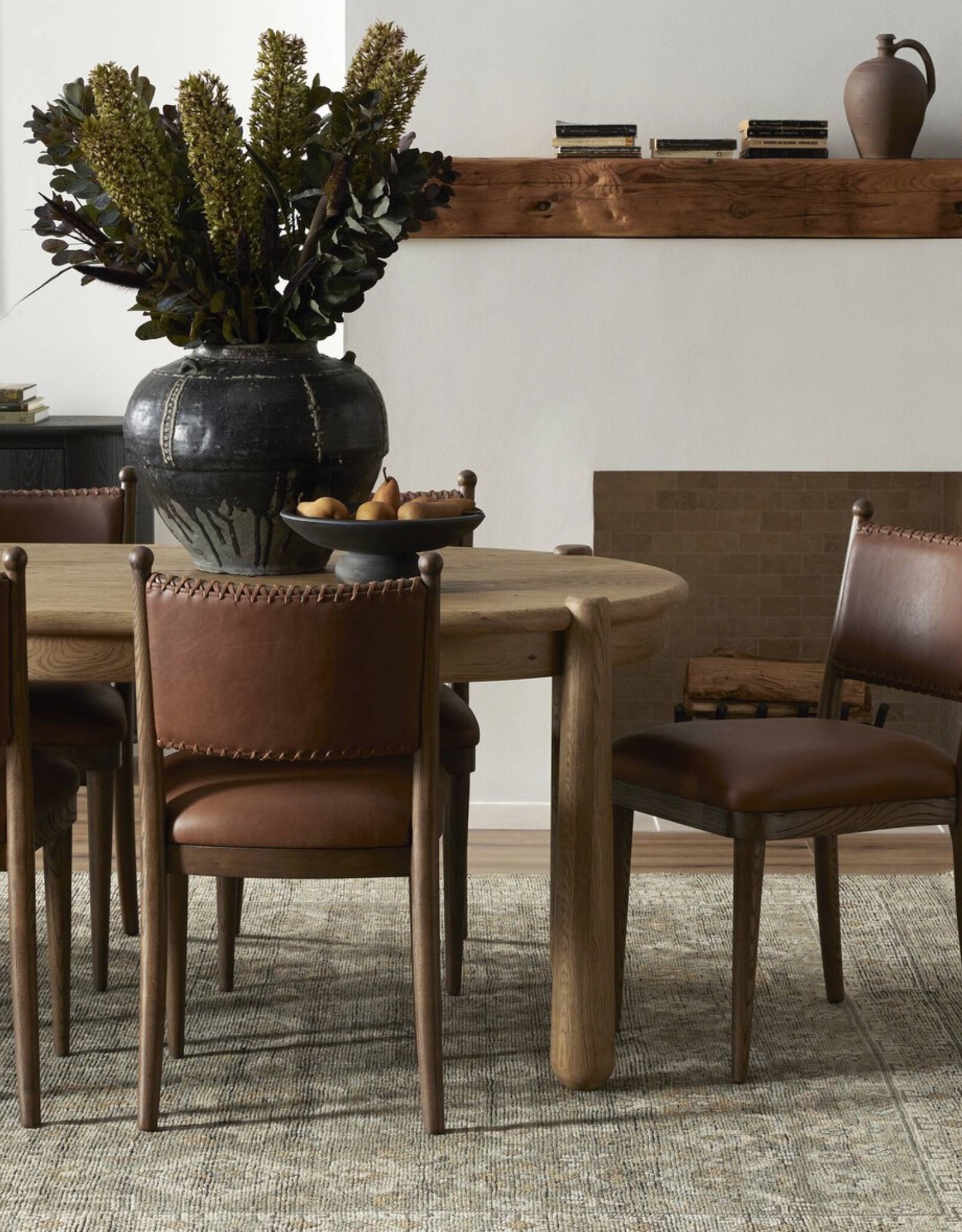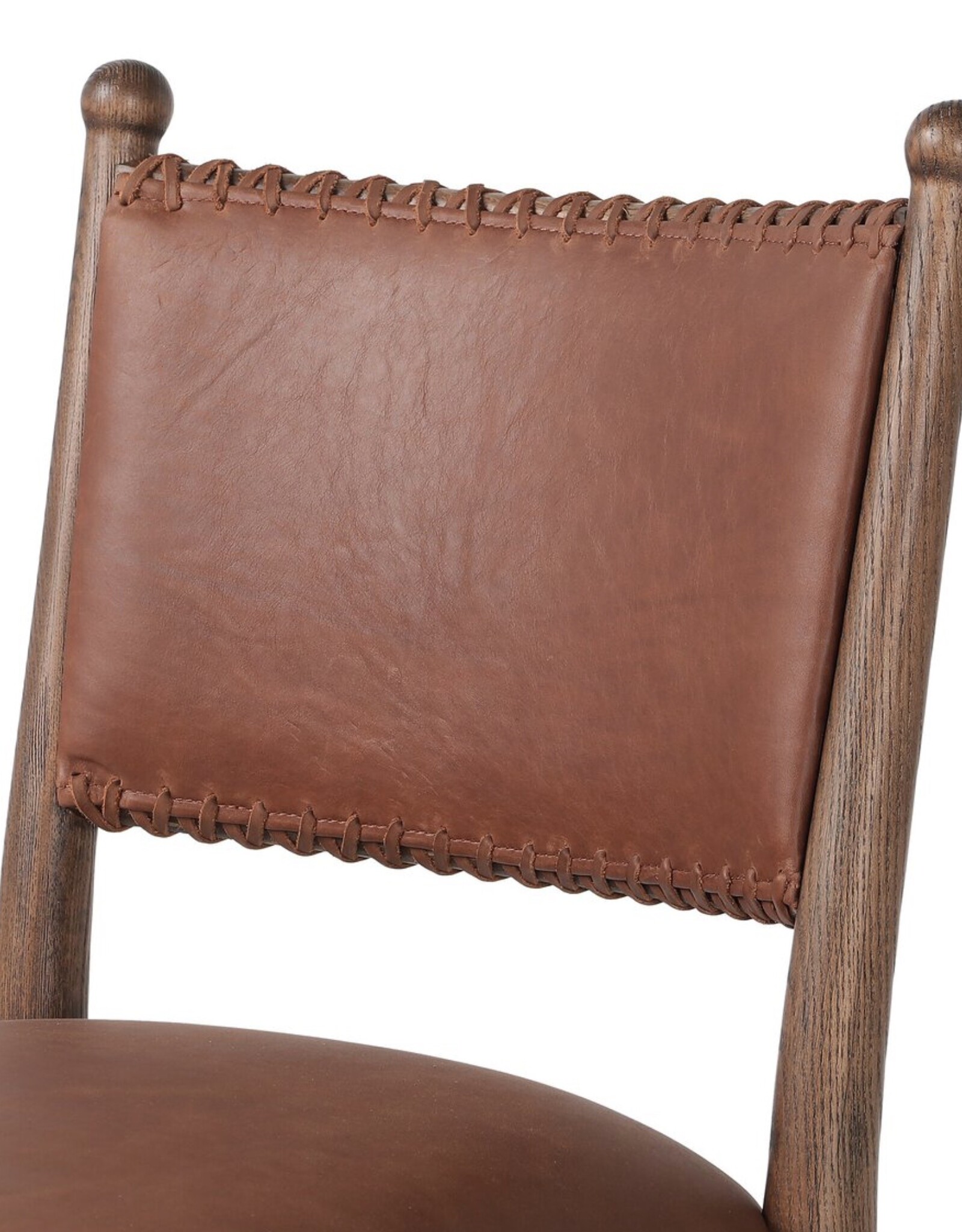 A classic dining chair silhouette, updated with organic styling. Mahogany leather with exaggerated stitching details pairs with an antique walnut frame, accented with curved legs and simple finial details.