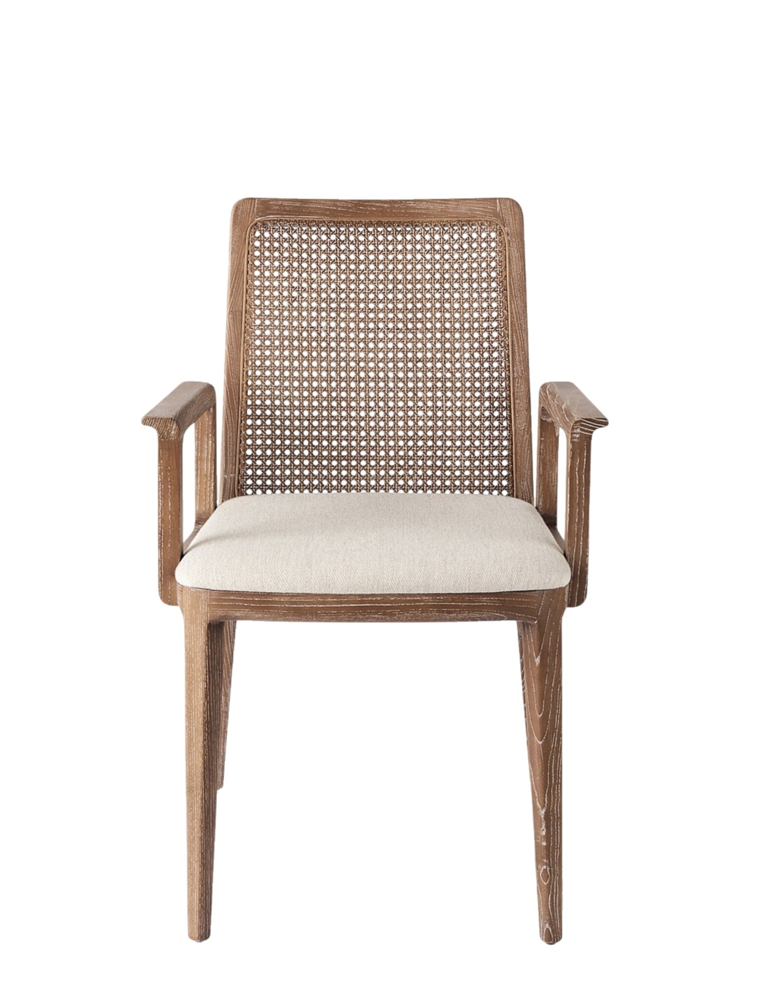 A whitewash finish extends over the wooden frame and cane back, bringing out the natural wood grain and adding a sense of depth and texture to the piece, with the slightest hint of rustic charm. The creamy beige fabric blends with the natural tones and helps create a soft, fresh aesthetic. The Clara is well-balanced option that ticks all the boxes! Open-frame armrests offer comfort without compromising too much on its compact nature, while a padded seat and slightly sloped back provide soft, but firm support.