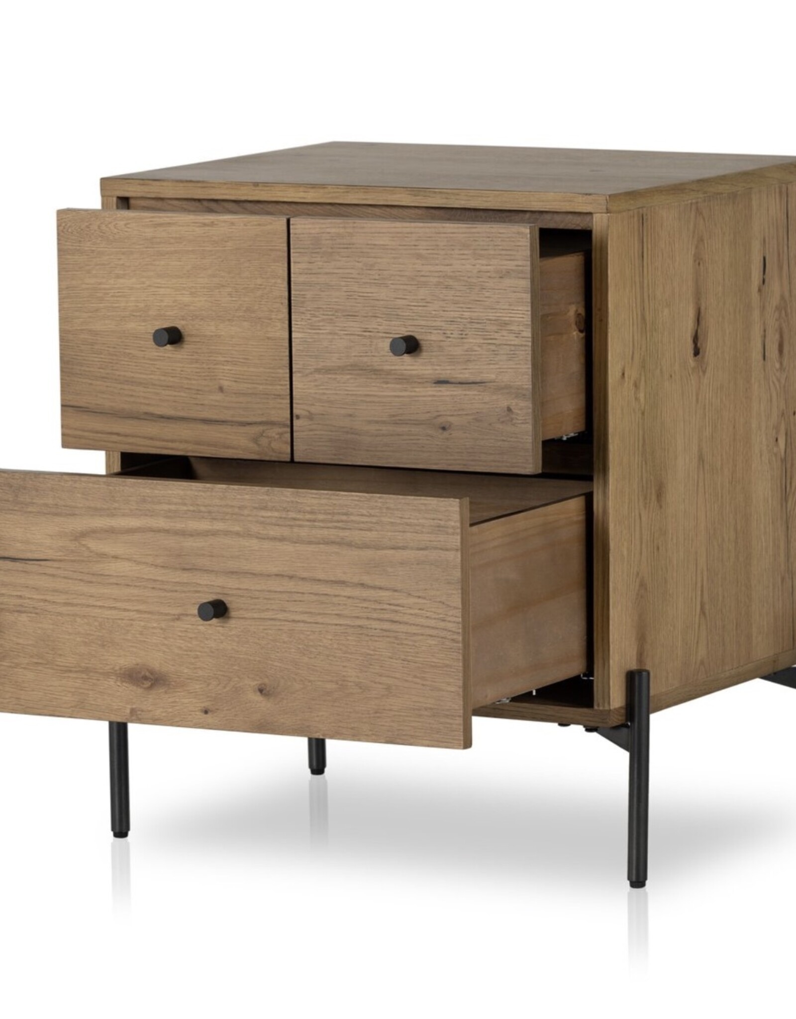 Clean and streamlined. Medium-finished oak features three drawers plus gunmetal-finished hardware, for a crisp look that's always in style. Dark resin plays up natural graining for texture and authenticity.