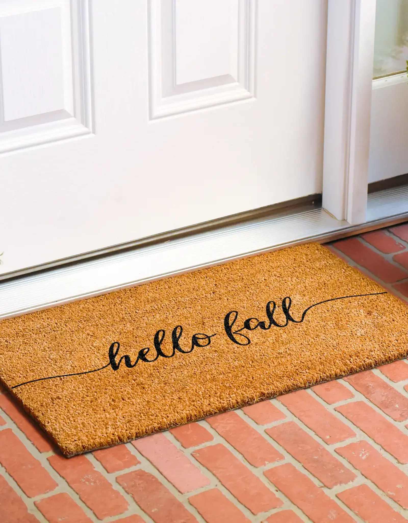 Welcome the autumn season with our Hello Fall Doormat, featuring a cozy and inviting design that captures the spirit of the season. Crafted with durable materials and seasonal charm, this delightful mat sets a warm and welcoming tone for your doorstep. Embrace the crisp air, vibrant colors, and pumpkin spice as you invite visitors into your home, where every step is met with the comforting greeting of "hello fall." Made of natural coir, a dense fiber that is naturally mold and mildew resistant. Coir is a renewable resource that is durable and coarse, excellent for scraping shoes clean. Vinyl backed for increased durability and to help prevent movement, coir doormats are weather tolerant absorb moisture and retain their shape. For best results keep in a sheltered area such as a covered porch, keeping extreme moisture and sunlight to a minimum. Vacuum, sweep or lightly hose clean. 70% coir, 30% vinyl.