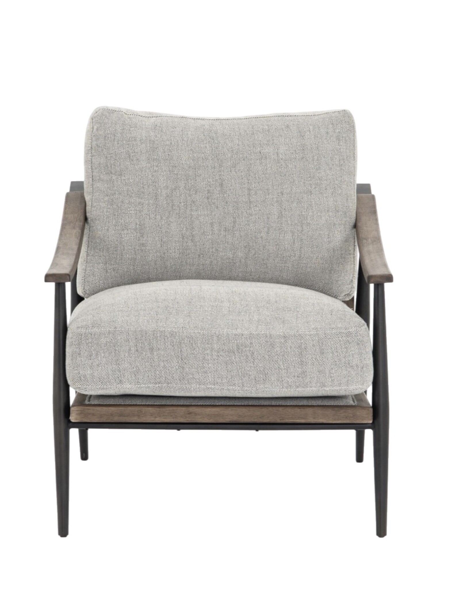 Comfort and class in one chic silhouette. Sloped wooden arms and forged, gunmetal-finished legs frame cushy feather-blend seating covered in a textural grey twill, striking great tonal balance between warm and cool.