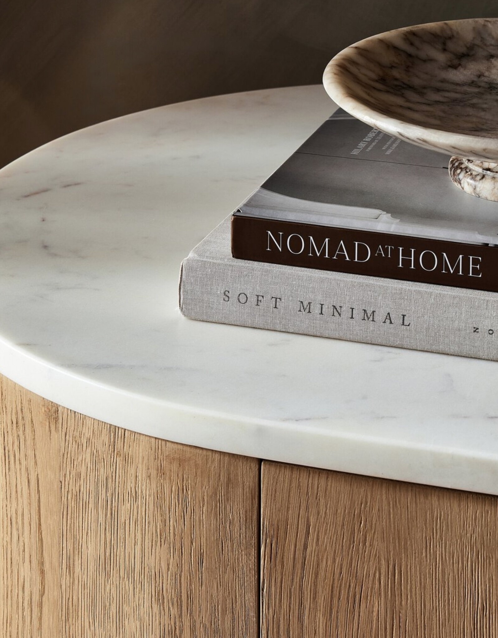 The clean lines of this rounded sideboard are uninterrupted by hardware — simply push the latch door for access. With a light blonde oak base and a white marble surface, this piece is a study in contrasting natural materials.